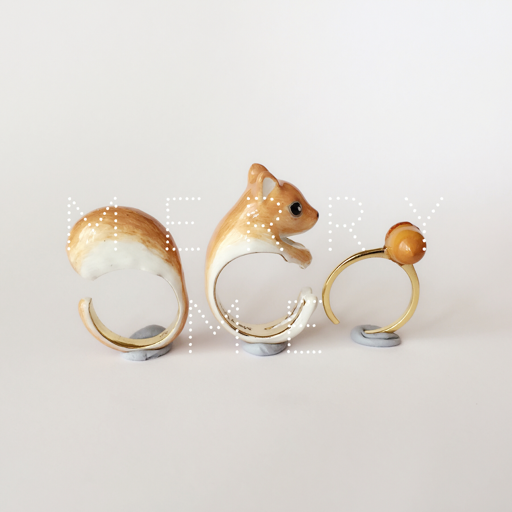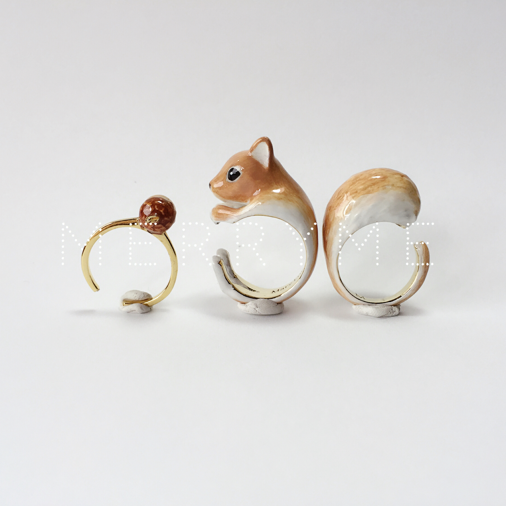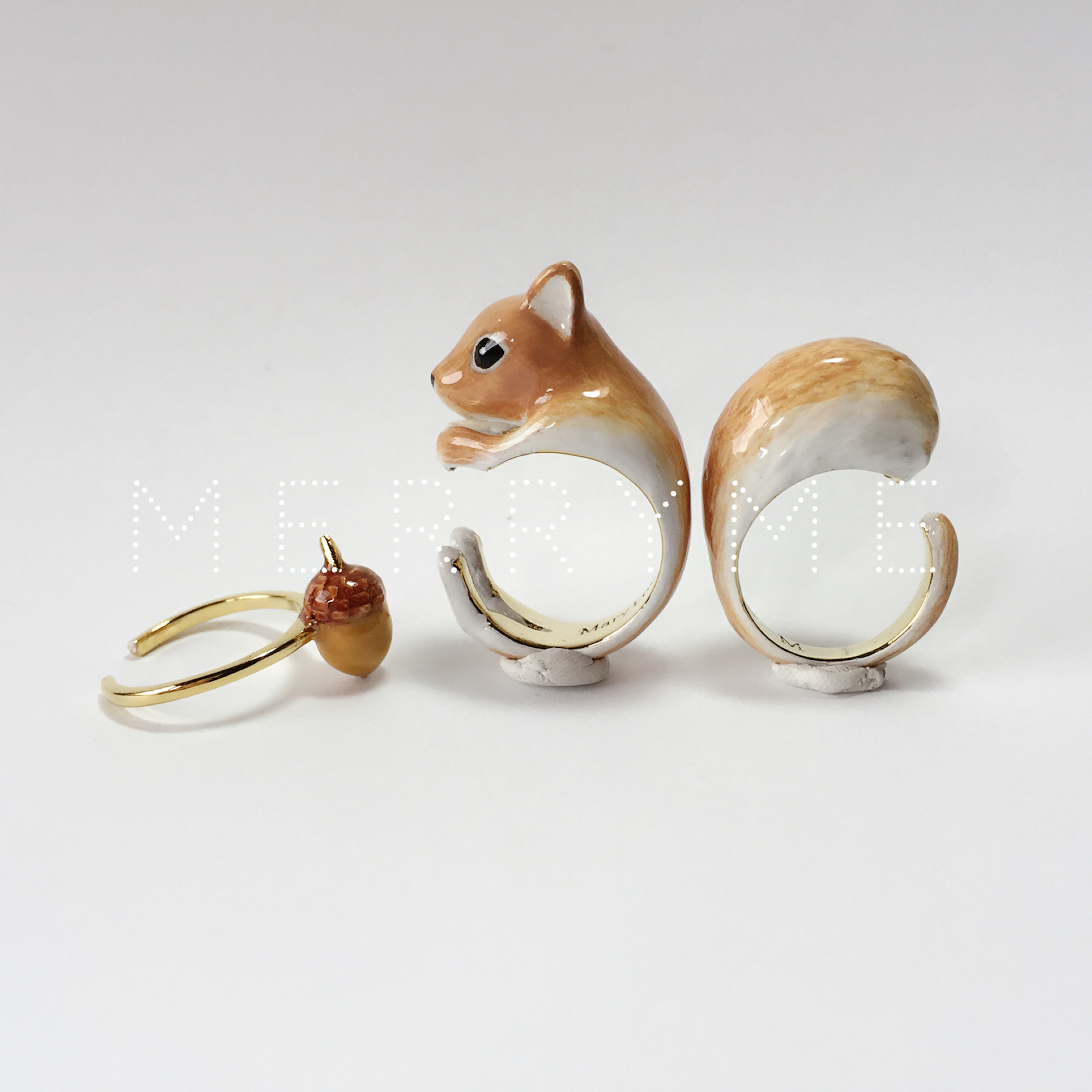 A lovely set of Squirrel ring set designed by Thai Designer Meau. A set of ring includes: squirrel body + tail + acorn ring.